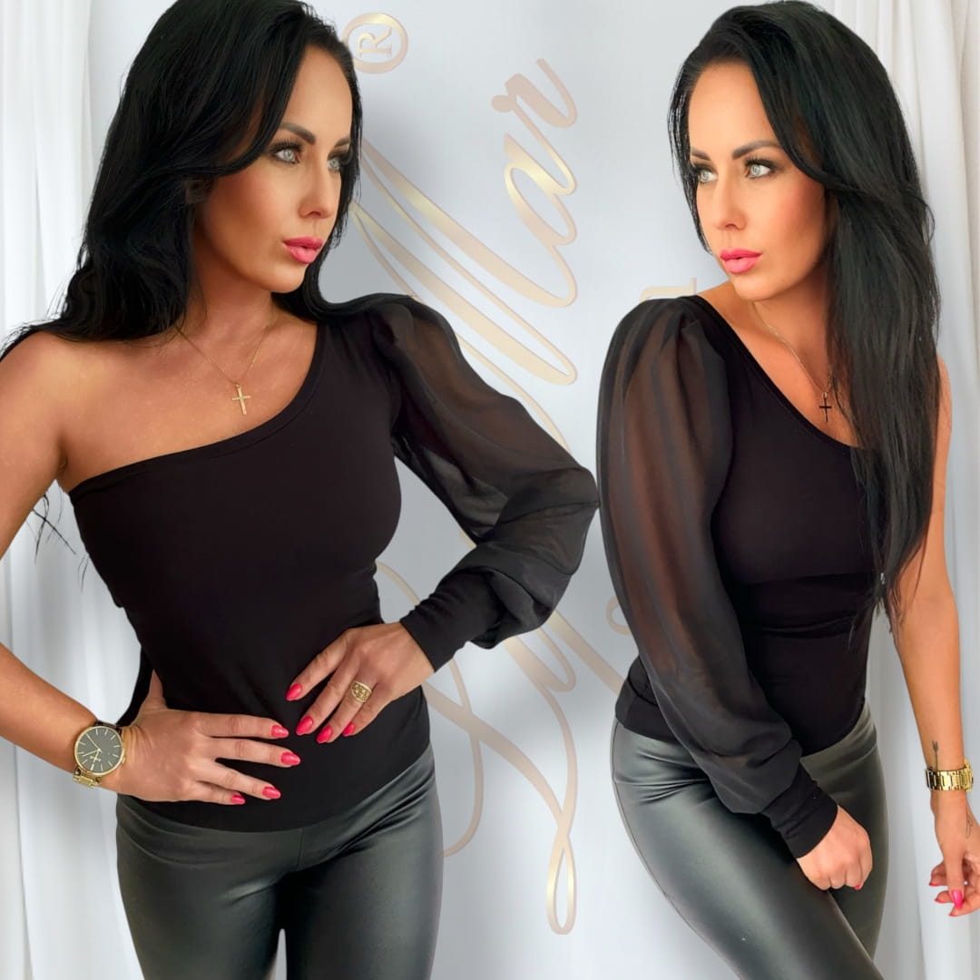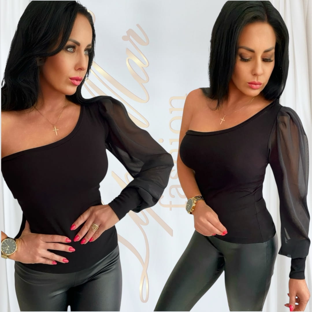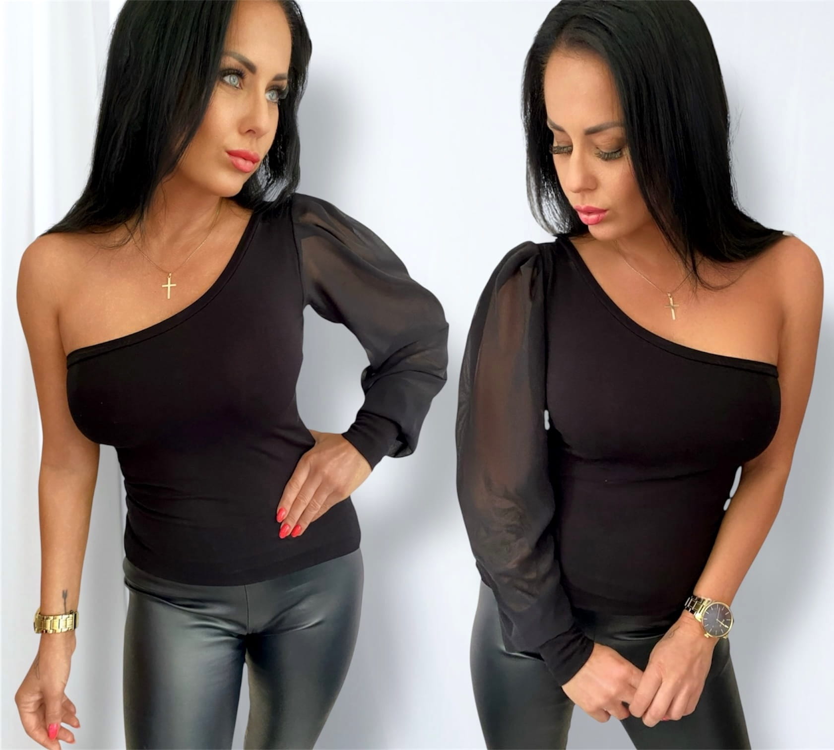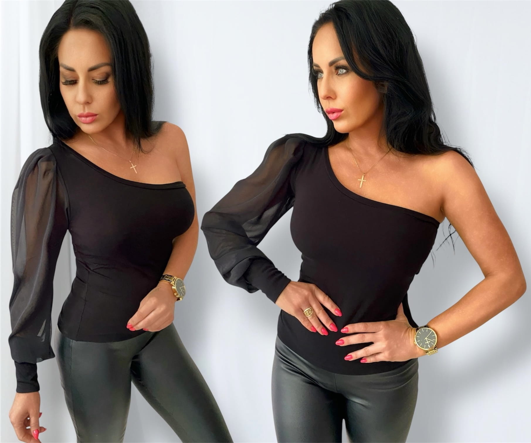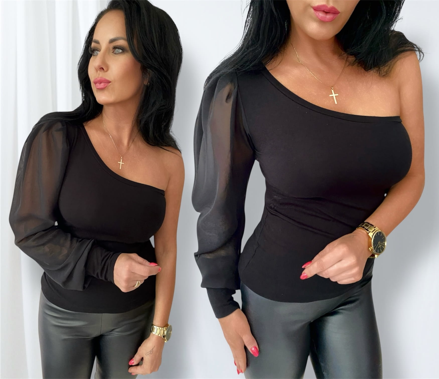 Ta czarna bluzka z jednym tiulowym rękawem łączy klasyczną elegancję z nowoczesnym designem. Wykonana z elastycznej dzianiny, pięknie dopasowuje się do sylwetki, podkreślając kobiece kształty.