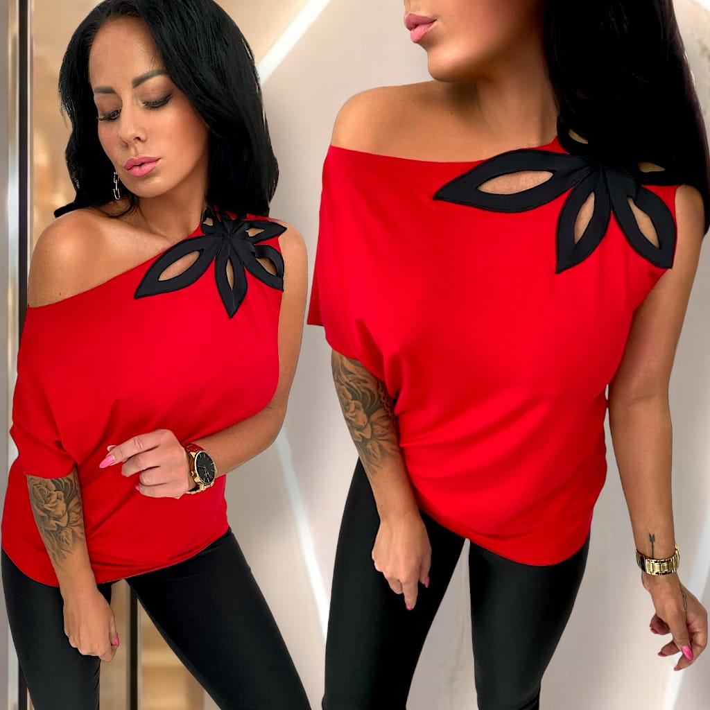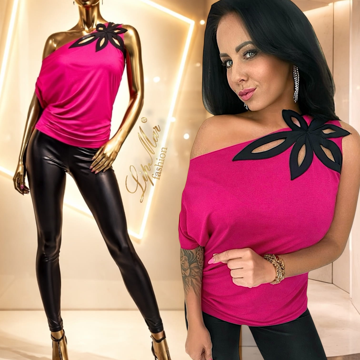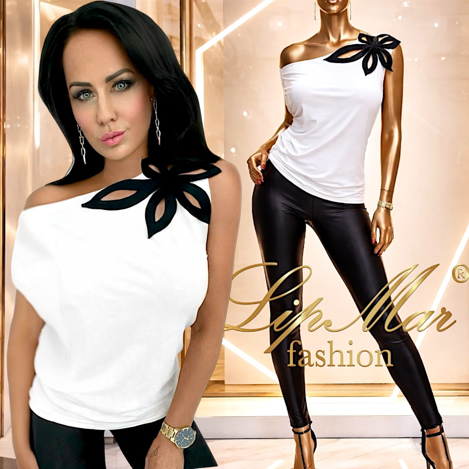 Bluzka damska oversize z odkrytym ramieniem i kwiatem 3D - luźna, zwiewna, efektowna | LipMar