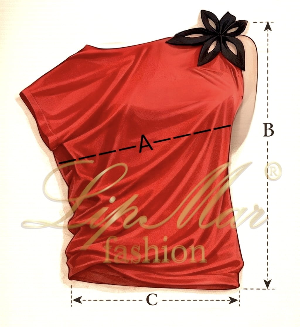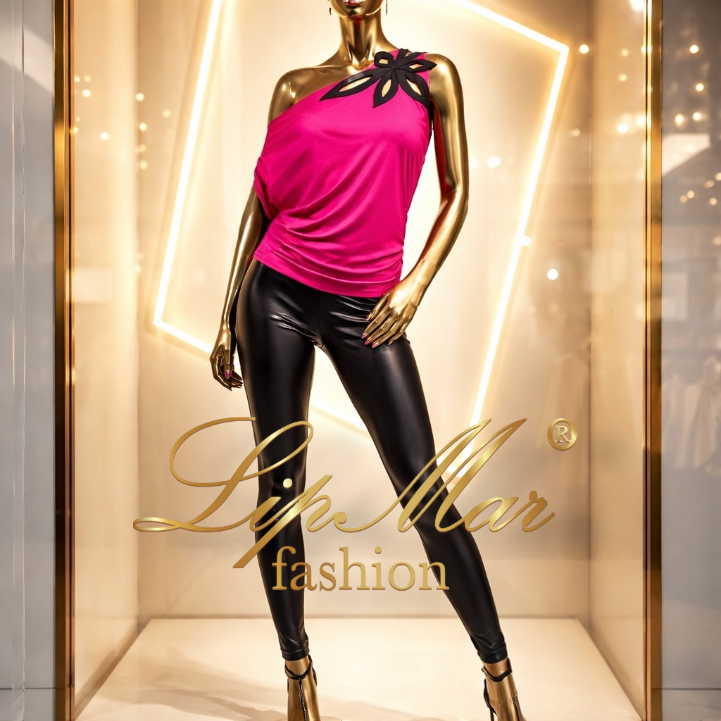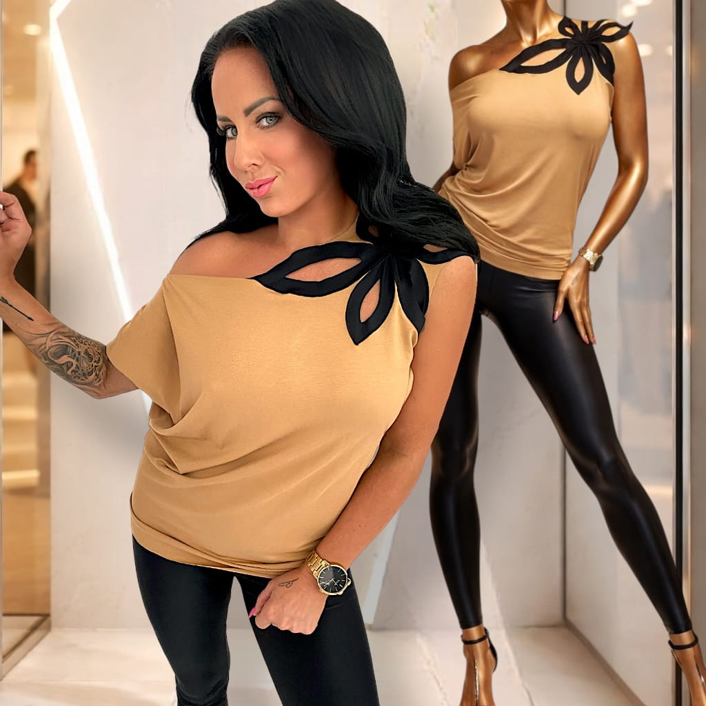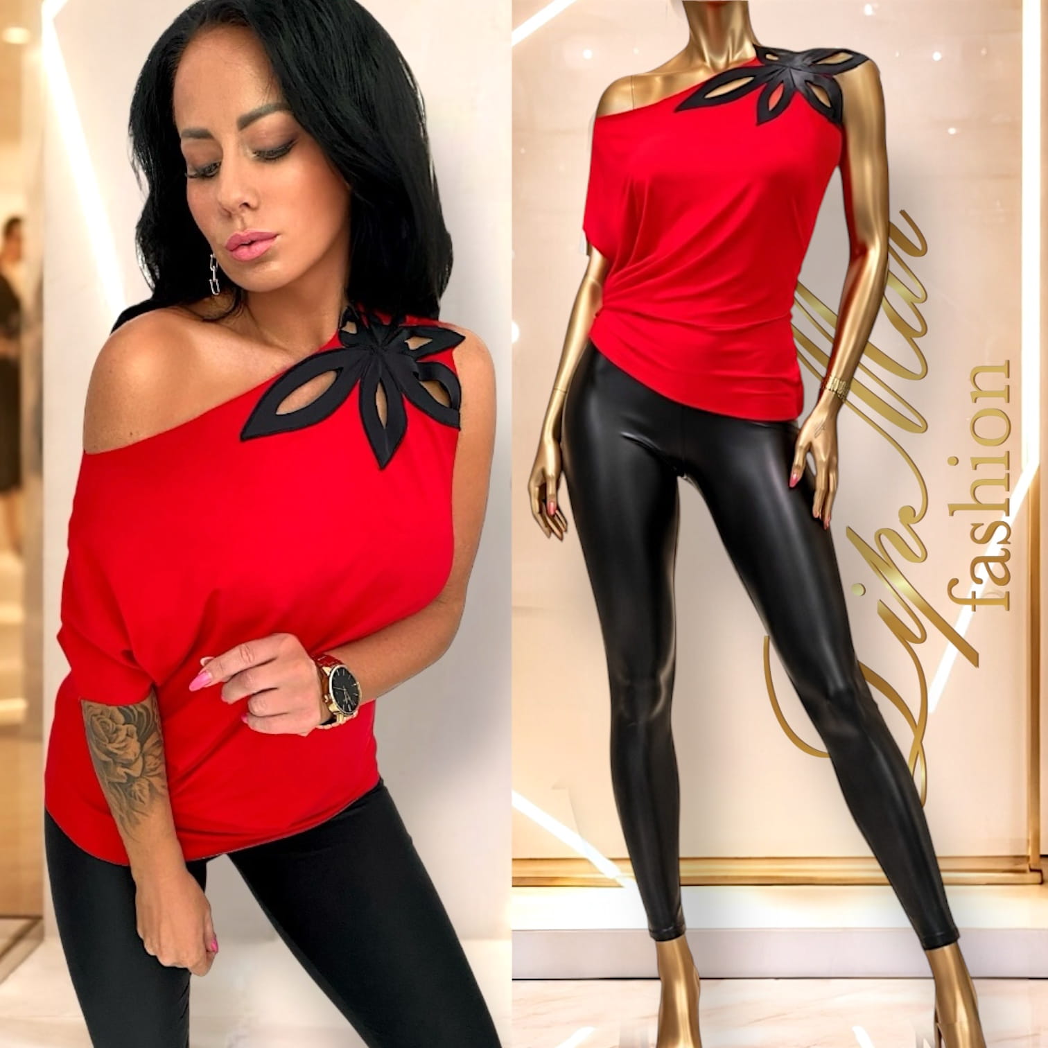 Bluzka damska oversize z odkrytym ramieniem i kwiatem 3D - luźna, zwiewna, efektowna | LipMar