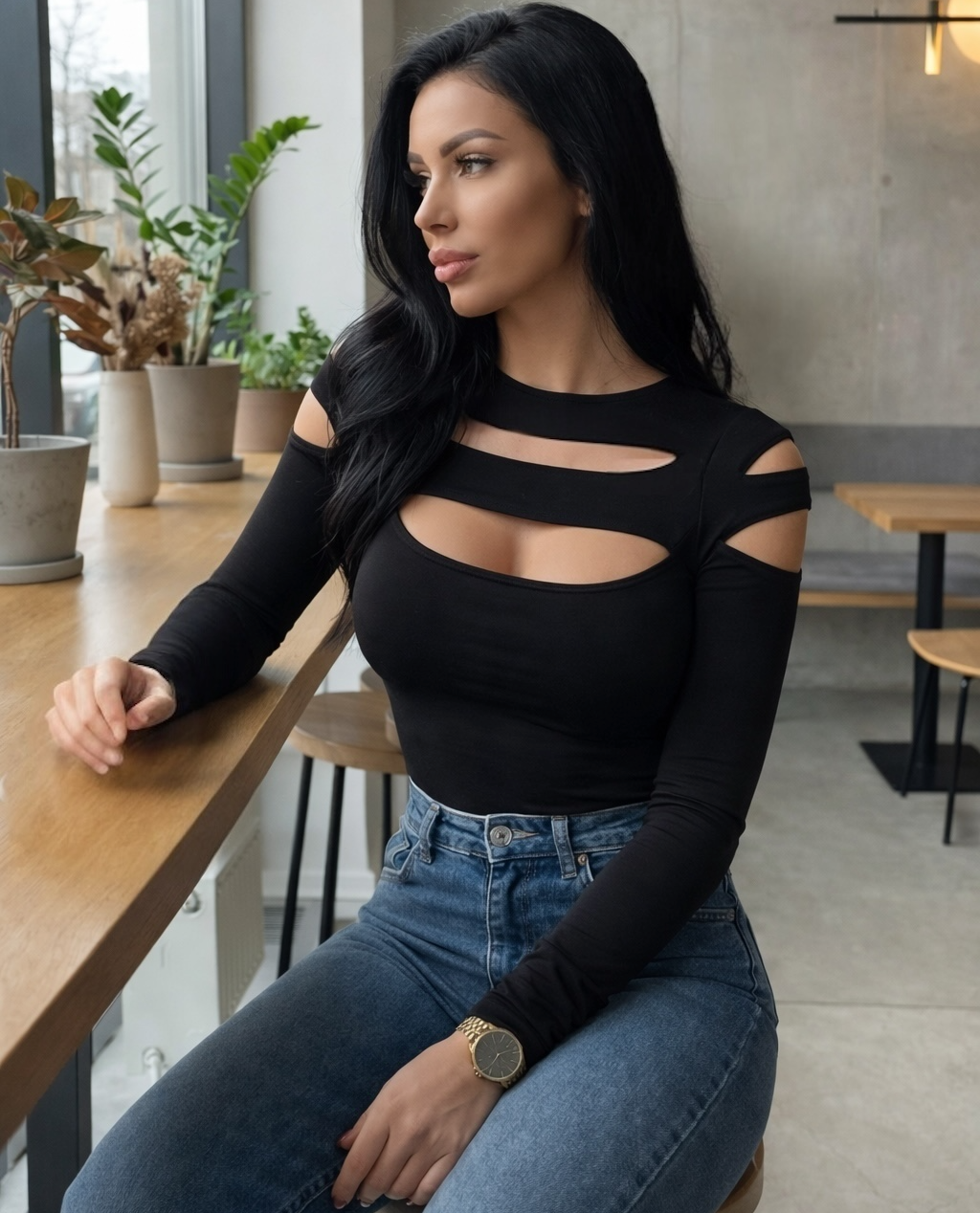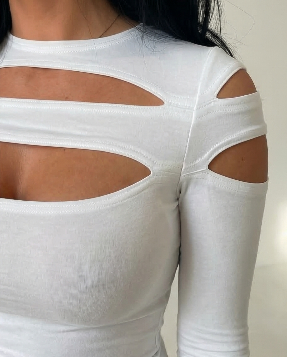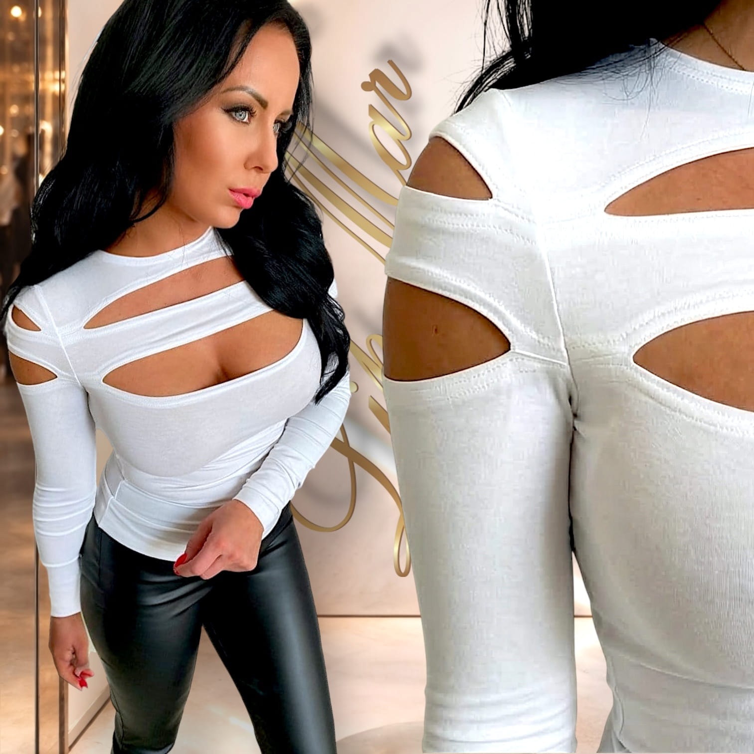 Bluzka damska cut out z wycięciami na dekolcie i rękawach, długi rękaw | LipMar