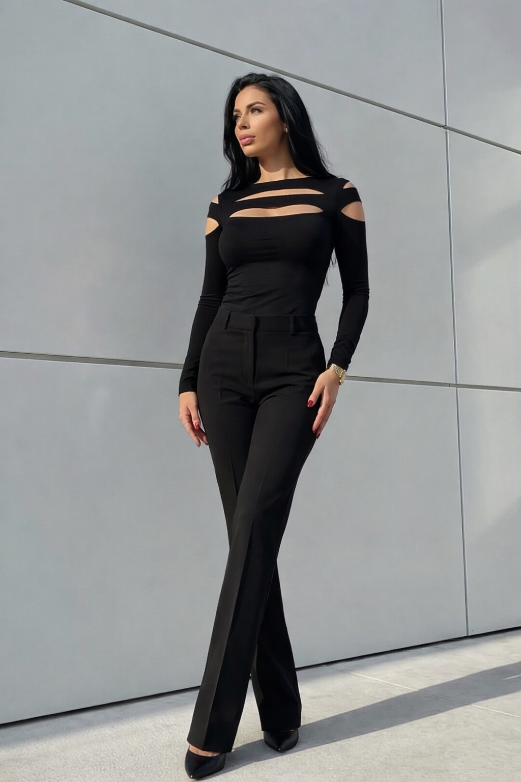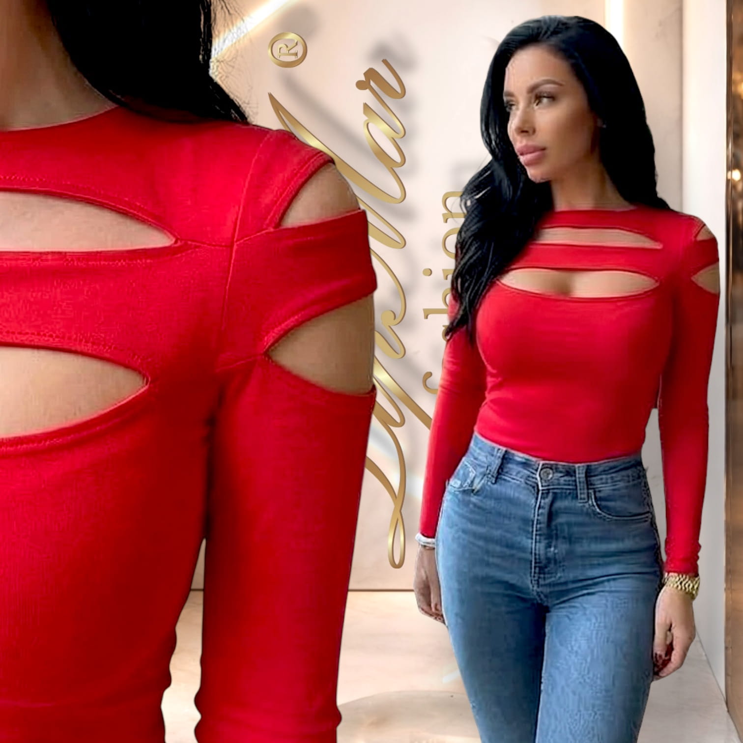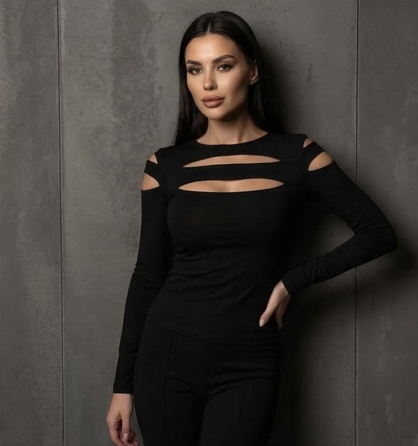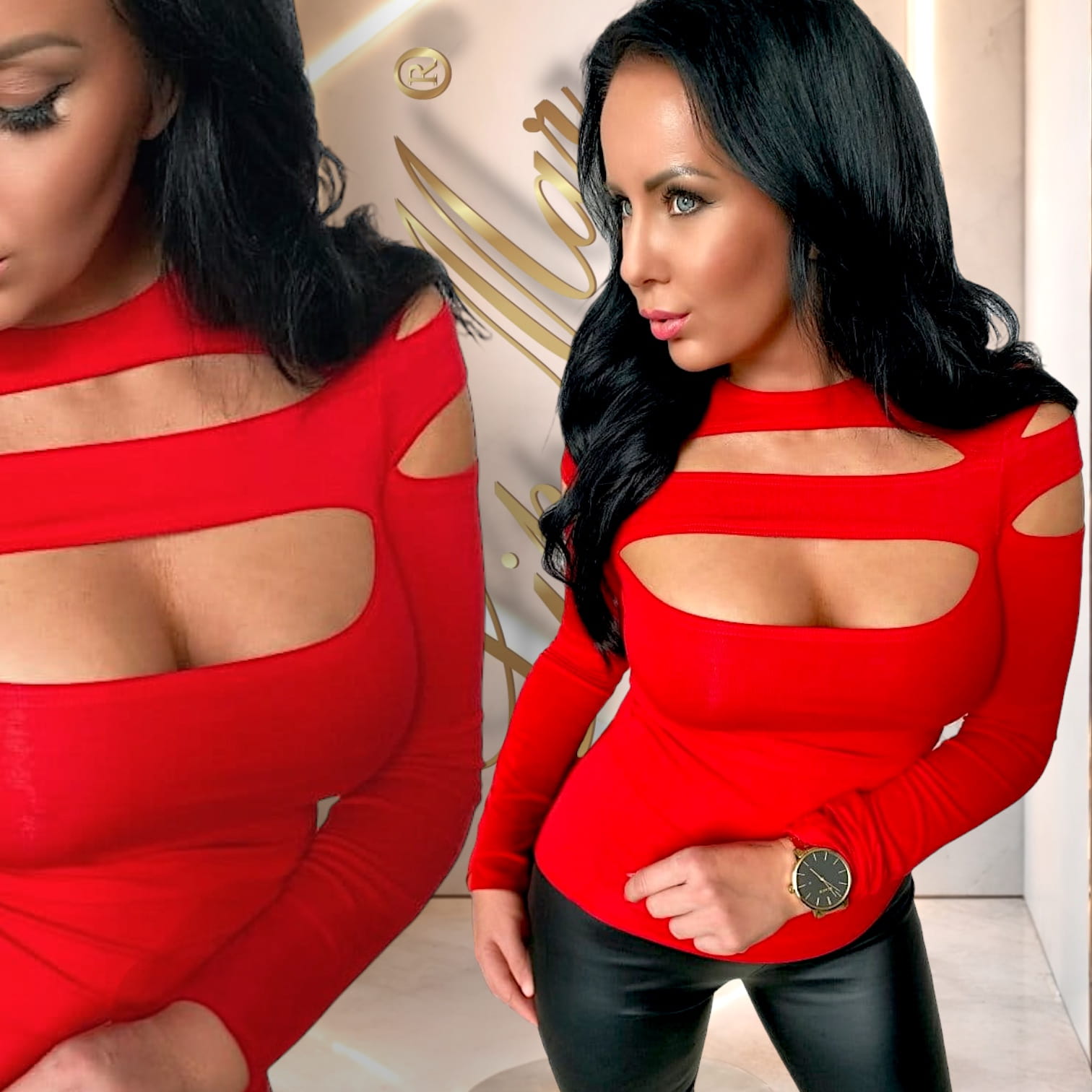 Bluzka damska cut out z wycięciami na dekolcie i rękawach, długi rękaw | LipMar