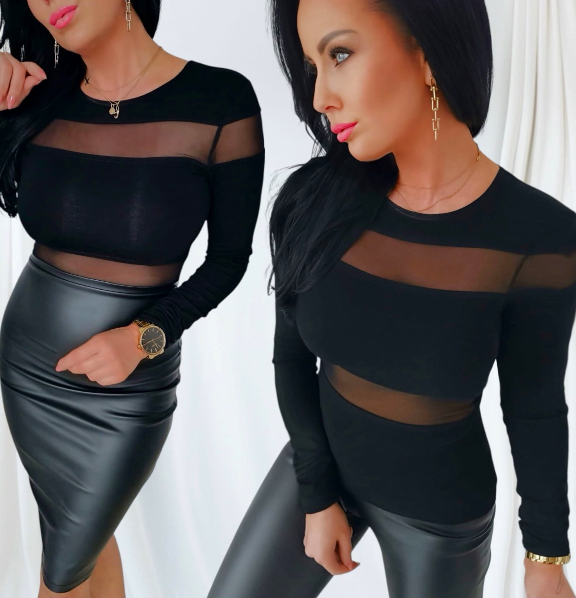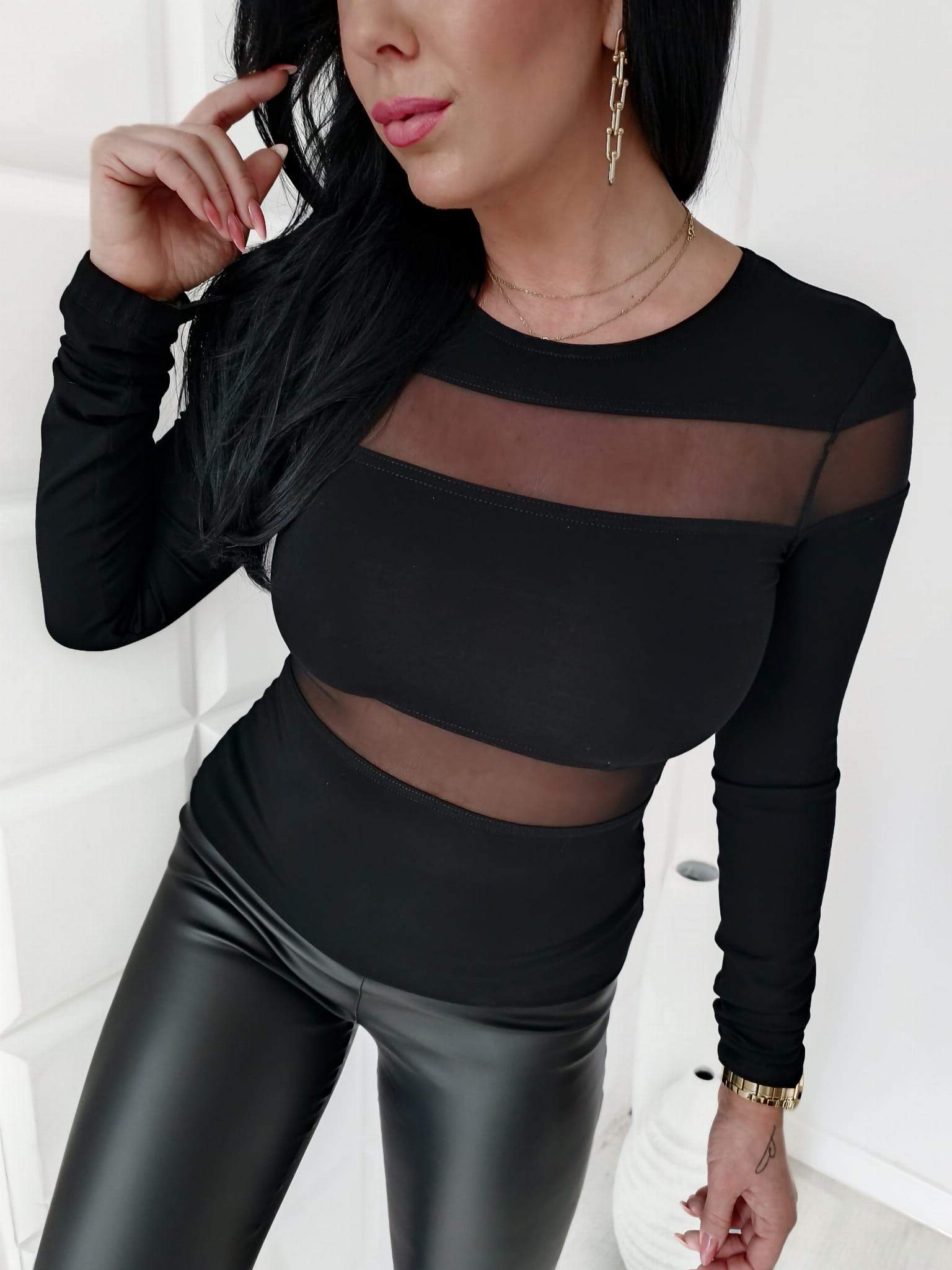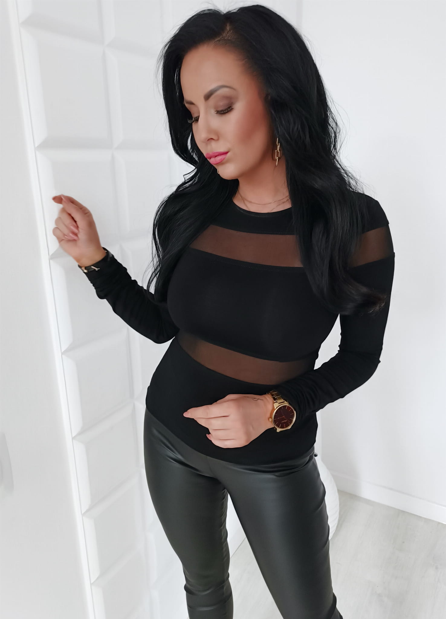 Bluzka damska czarna elegancka z pasami z transparentnej siateczki