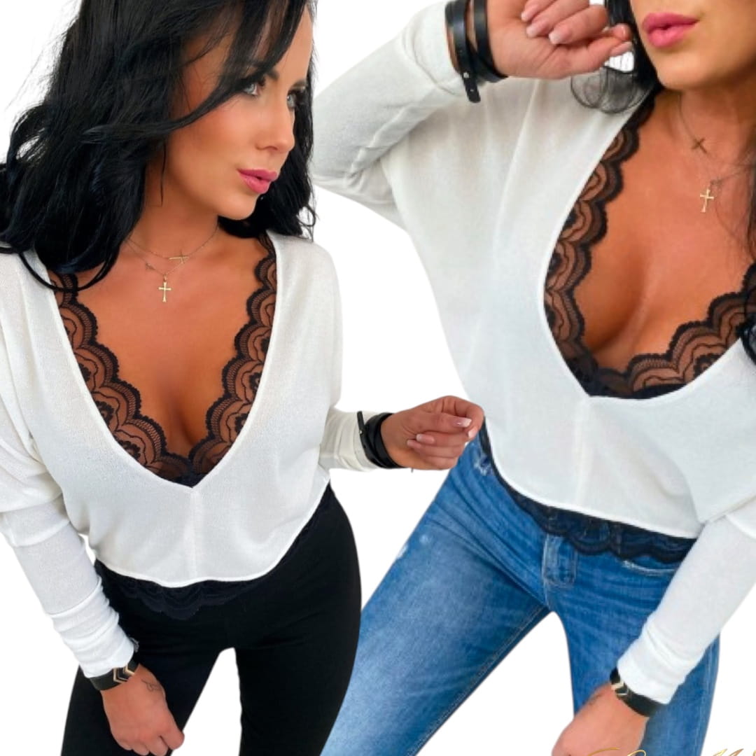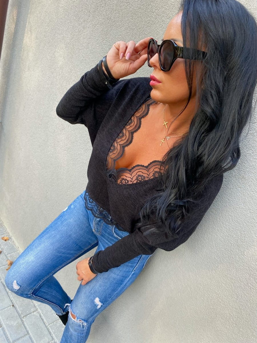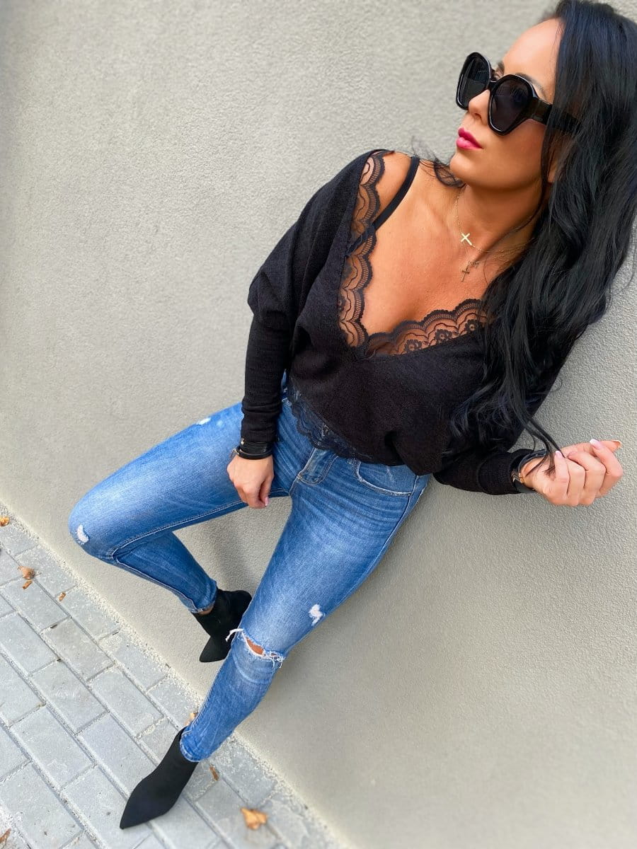 • Elegancki, kobiecy sweterek wykończony piękną koronką.