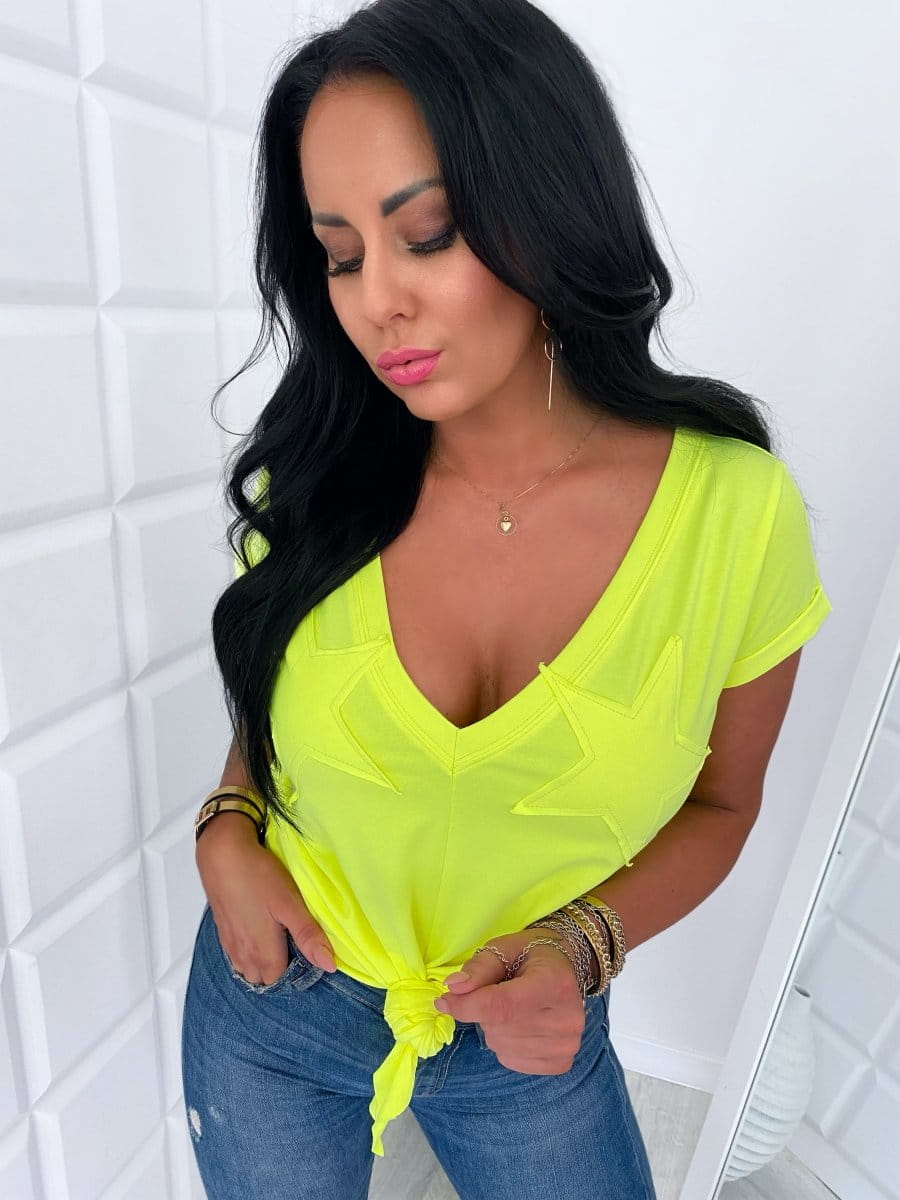 T-shirt STAR - bawełniany. T-shirt damski z dekoltem V i gwiazdami – wiązany na dole | LipMar