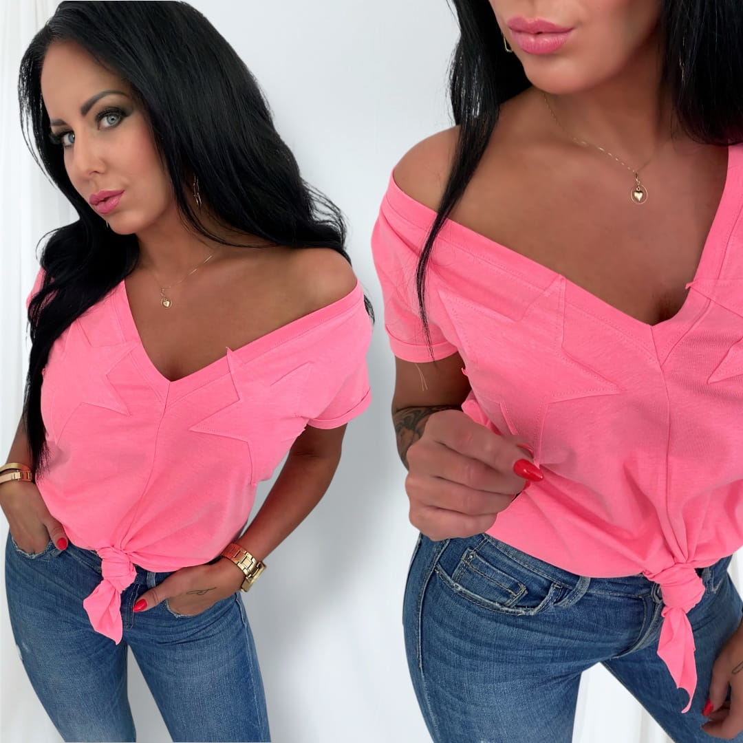 - Postaw na wygodę i styl z naszym t-shirtem damskim. Ten modny model z głębokim dekoltem w serek (V-neck) pięknie podkreśla szyję i biust, a wiązanie na dole pozwala dopasować koszulkę do sylwetki. Ozdobne, naszyte gwiazdy na biuście nadają całości niebanalnego, modowego charakteru.
