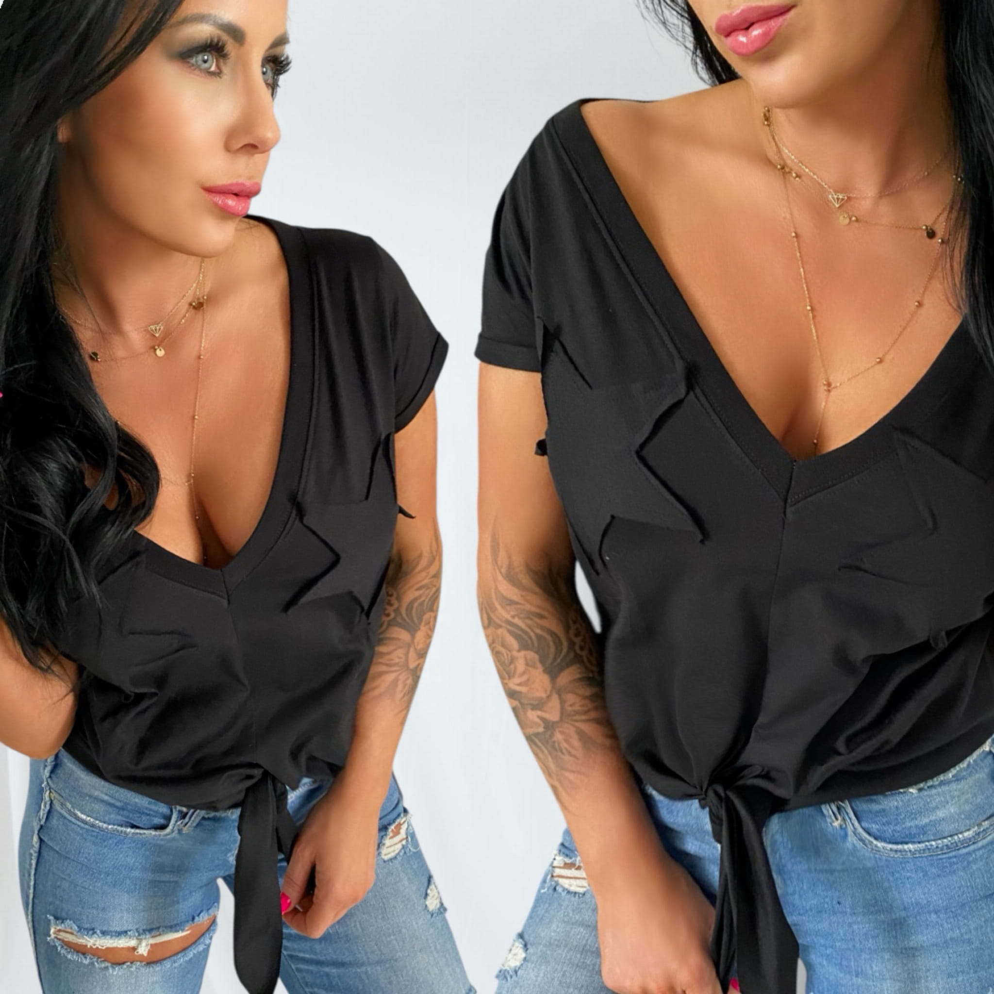 ° Stylowe detale: dekolt V i wiązanie na dole