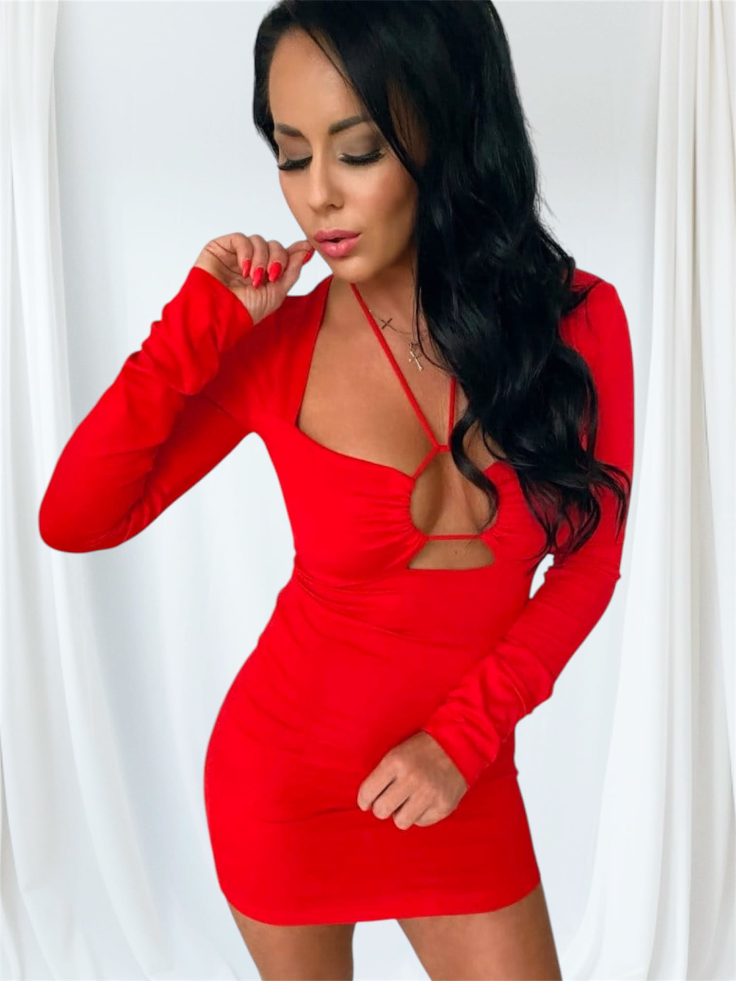 Sukienka z seksownym dekoltem czerwona, długi rękaw. LipMar