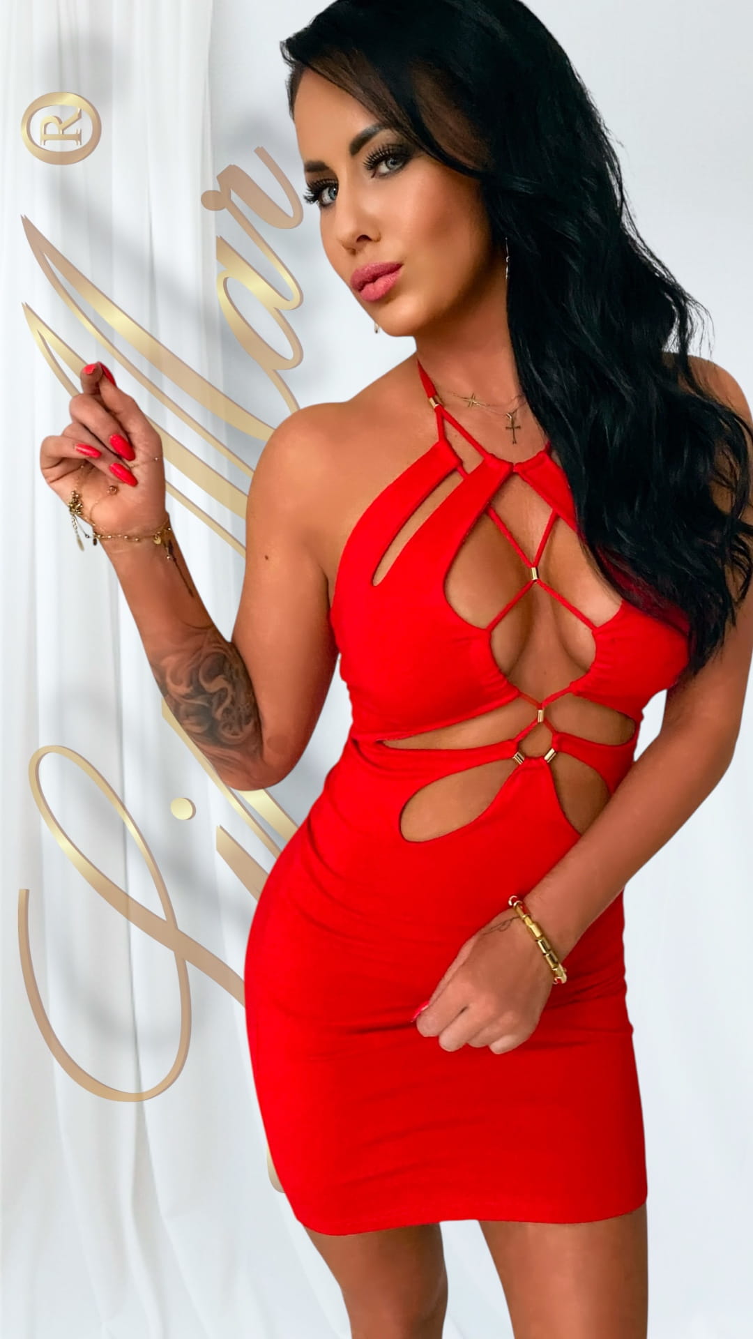 Ta elegancka sukienka w kolorze głębokiej czerni lub intensywnej czerwieni zachwyca niepowtarzalnym krojem, który zmysłowo podkreśla sylwetkę i subtelnie odsłania dekolt.