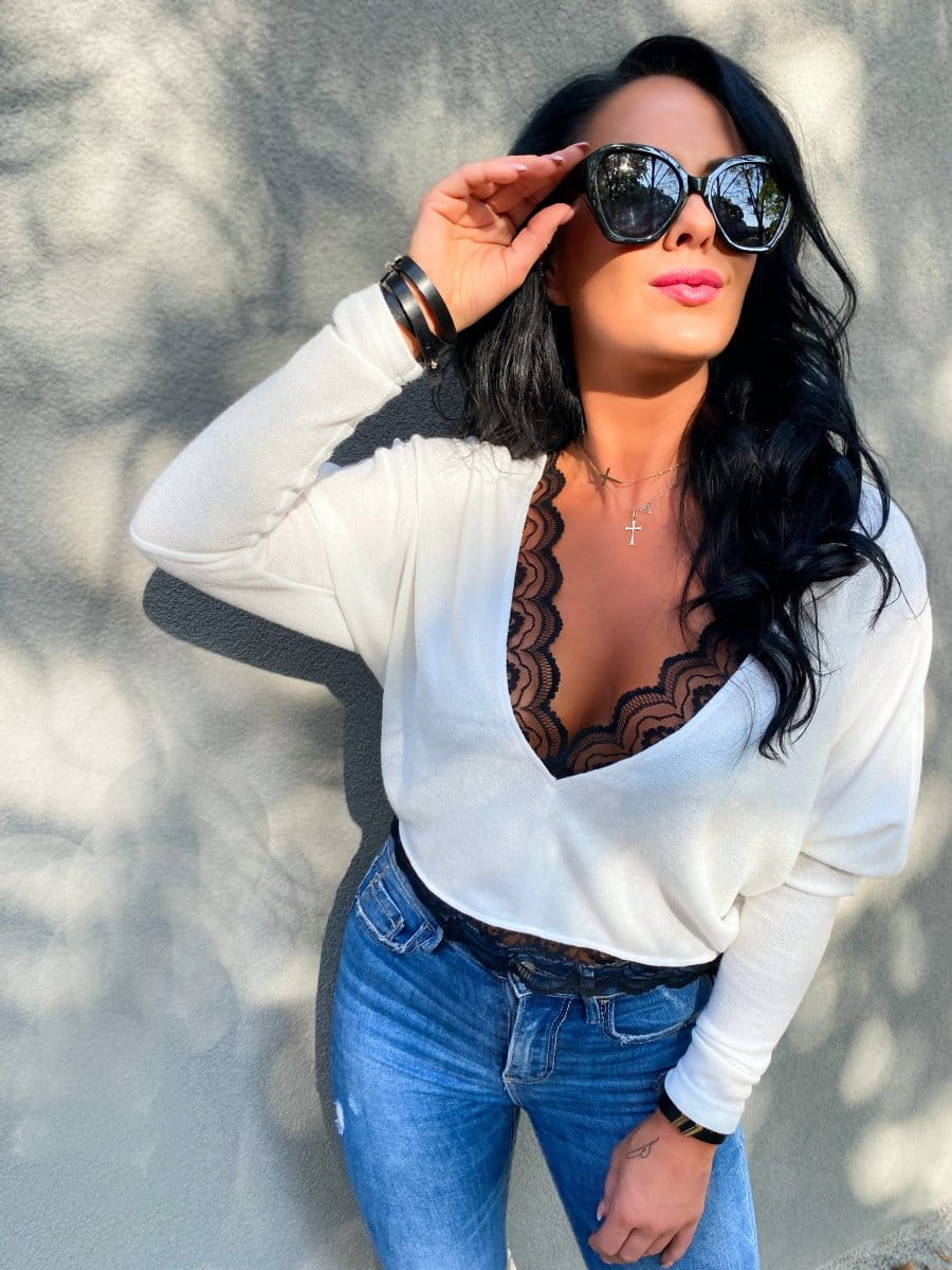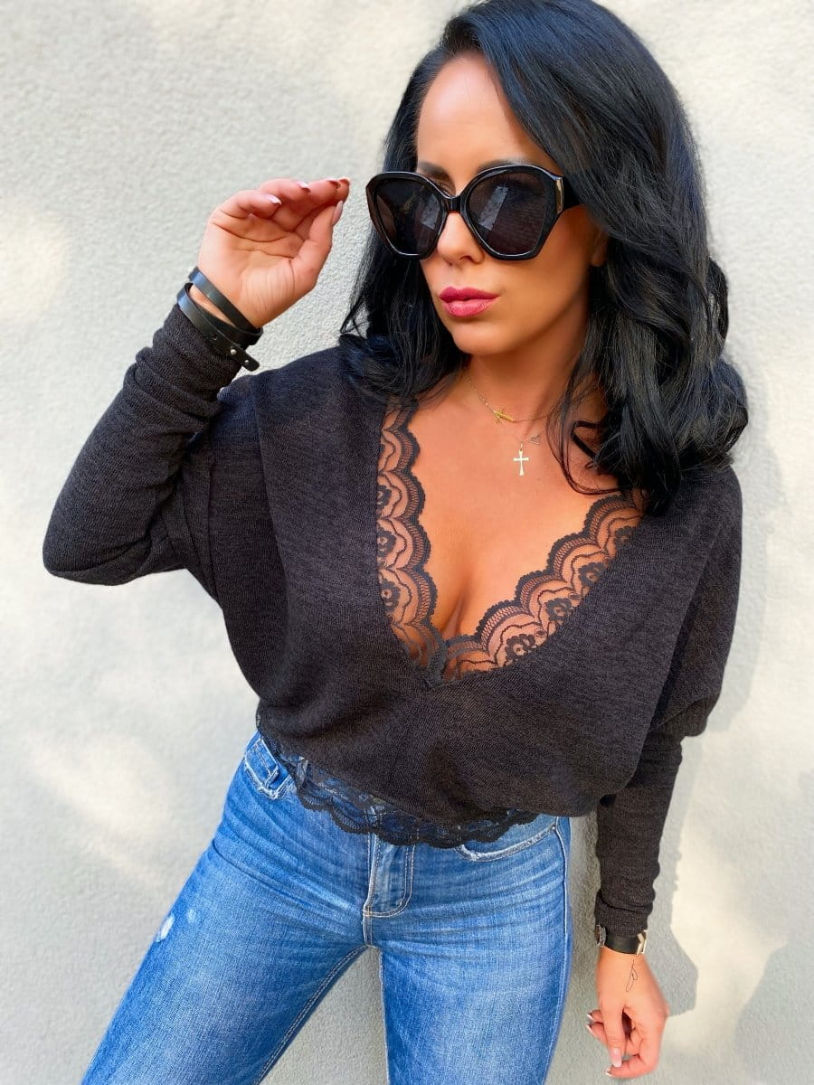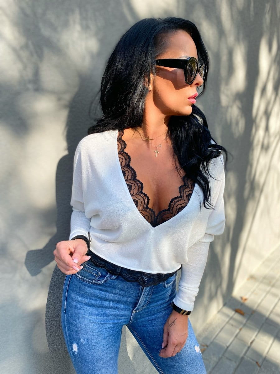 - Elegancki, kobiecy sweterek wykończony piękną koronką.