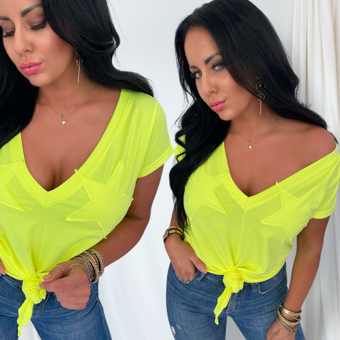T-shirt STAR - bawełniany. T-shirt damski z dekoltem V i gwiazdami – wiązany na dole | LipMar