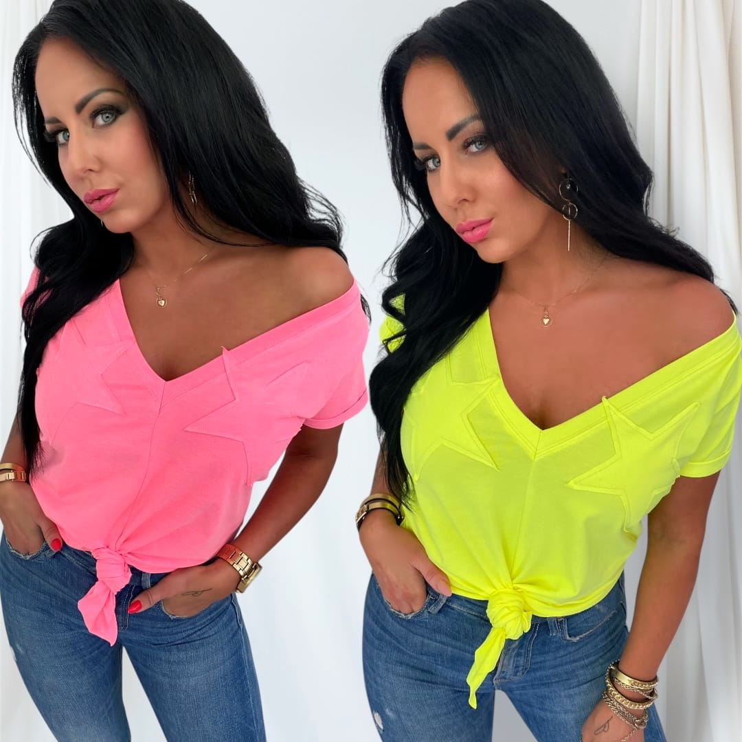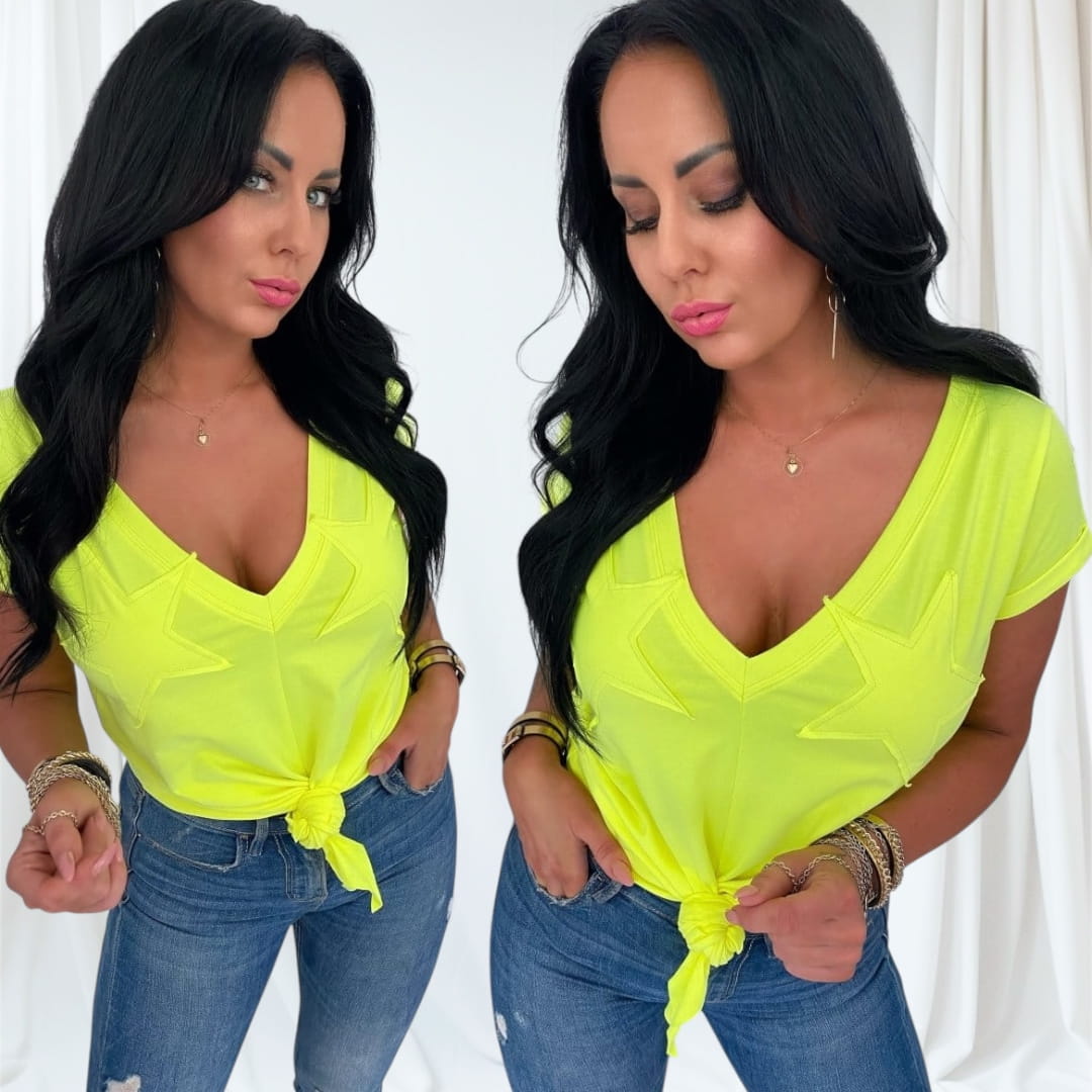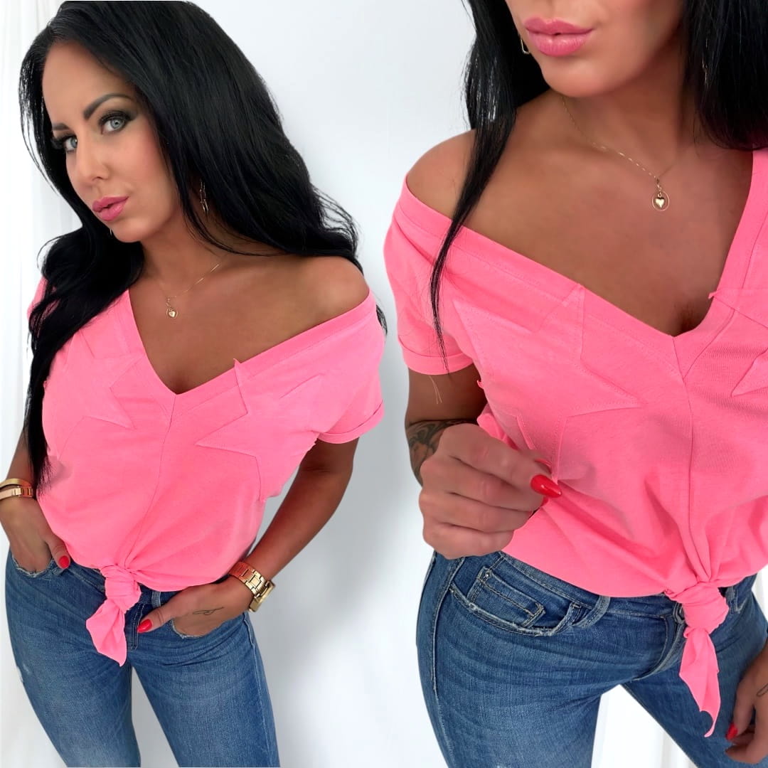 - Postaw na wygodę i styl z naszym t-shirtem damskim. Ten modny model z głębokim dekoltem w serek (V-neck) pięknie podkreśla szyję i biust, a wiązanie na dole pozwala dopasować koszulkę do sylwetki. Ozdobne, naszyte gwiazdy na biuście nadają całości niebanalnego, modowego charakteru.