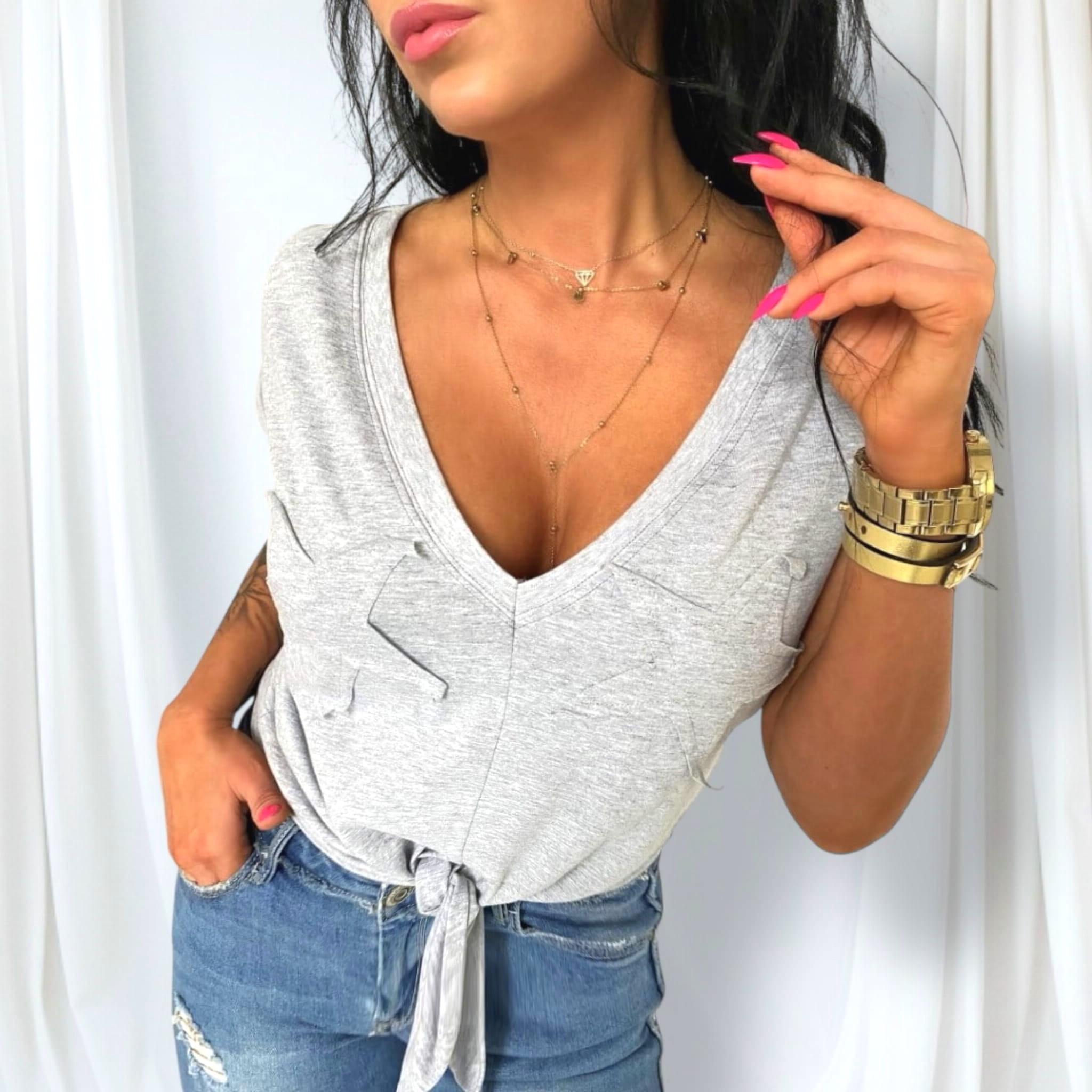 ° Stylowe detale: dekolt V i wiązanie na dole